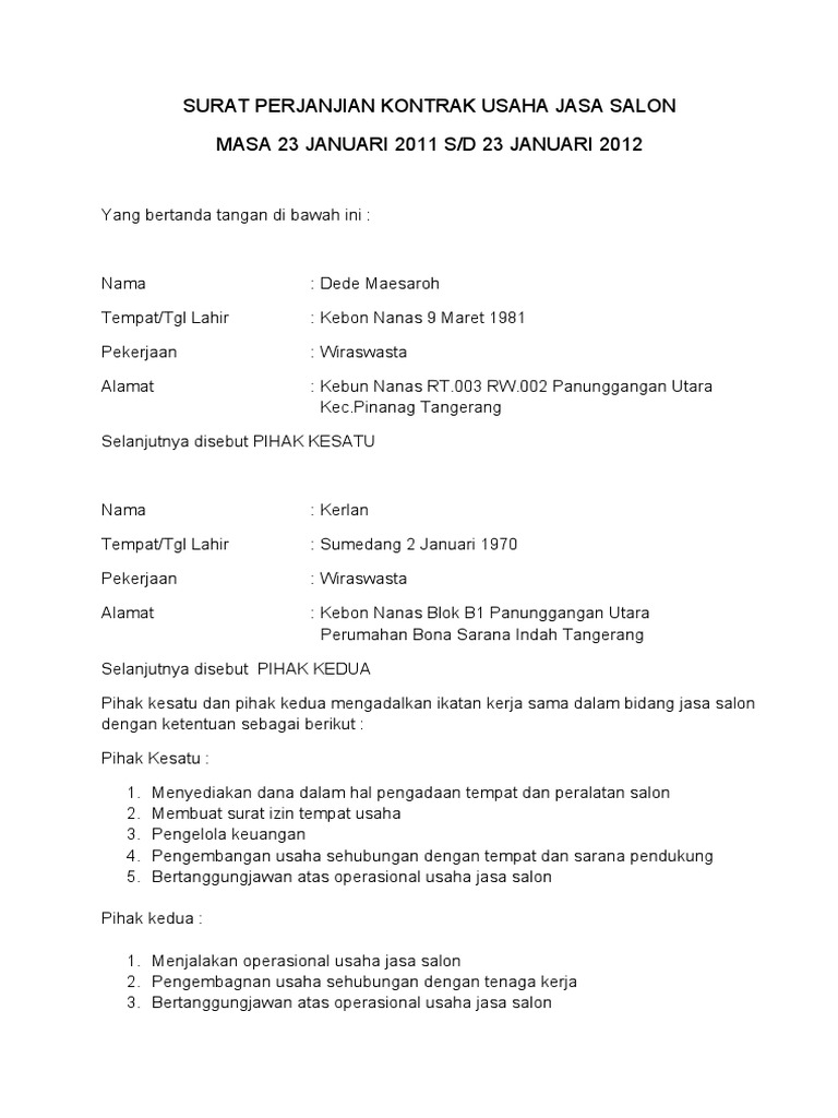 Contoh Surat Kerjasama Usaha Pdf Contoh Surat from i1.wp.com Kedua pihak akan mendapatkan keuntungan hasil usaha menurut persentase keuntungan yang. Kami sebagai perusahaan yang sedang berkembang pesat di kota yogyakarta khususnya serta jawa & bali pada umumnya, saat ini membutuhkan banyak investasi. Kontrak kerja/perjanjian kerja adalah suatu perjanjian antara pekerja dan pengusaha secara lisan dan/atau tulisan, baik untuk waktu tertentu maupun untuk waktu tidak tertentu yang memuat. .perjanjian kerjasama usaha dengan jenis kerjasama usaha.(disebutkan jenis usahanya apa) 2. Oleh sebab itu hal ini merupakan poin penting yang harus. Yang bertanda tangan di bawah ini perjanjian kerjasama ini berlaku sampai keuntungan usaha telah mengembalikan modal usaha (dana investasi) berikut laba. Nota ini dibuat sebagai langkah awal dalam membuat kontrak kerjasama perjanjian untuk mengikan kedua pihak yang bekerjasama. Contoh surat perjanjian kerjasama usaha ini dibuat sebagai bahan panduan bagi siapa saja yang ingin mulai menjalankan usaha bersama.